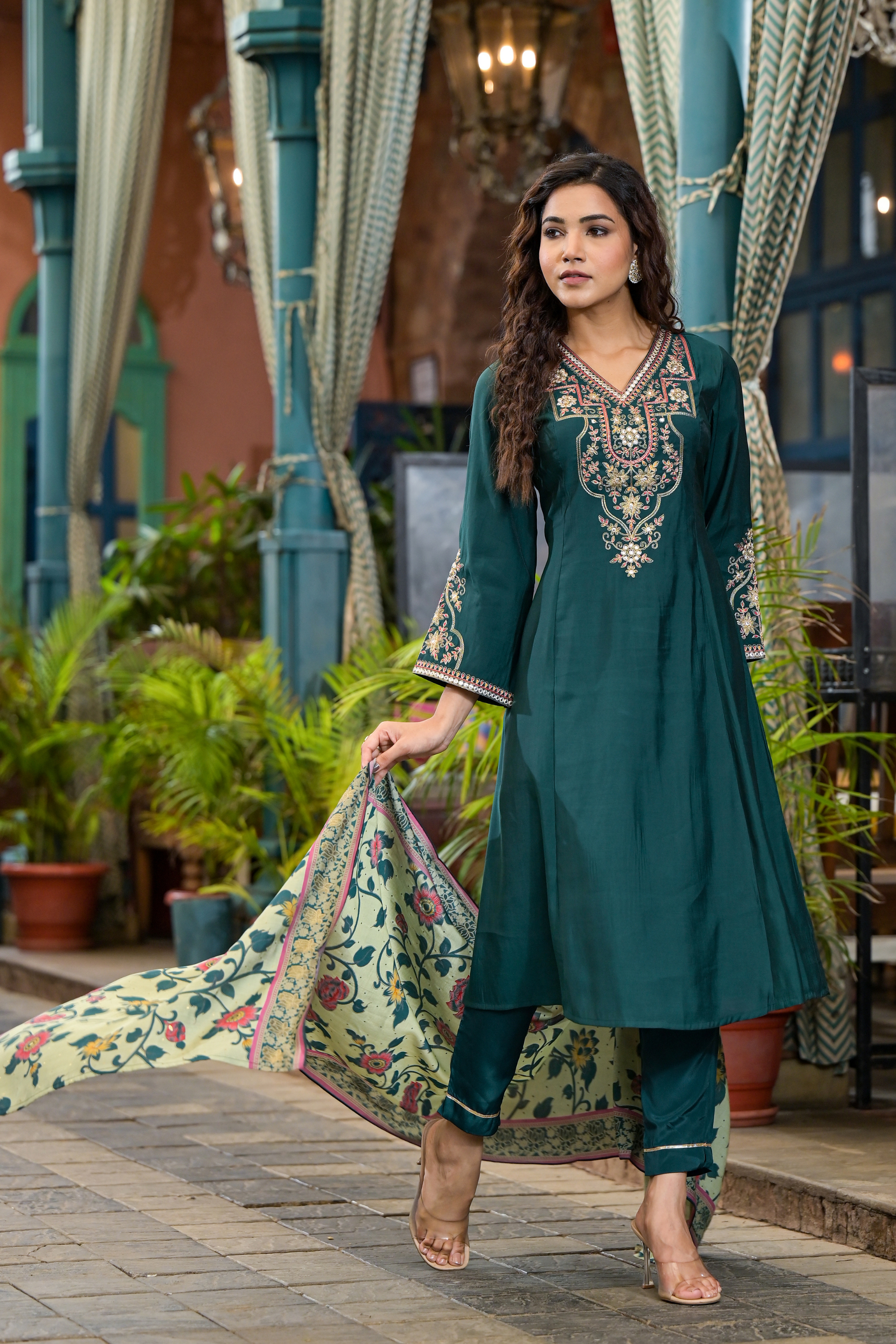 Elegant Green Modal Viscose Kurta Set with Floral Embroidery - A Harmonious Blend of Tradition and Contemporary Style